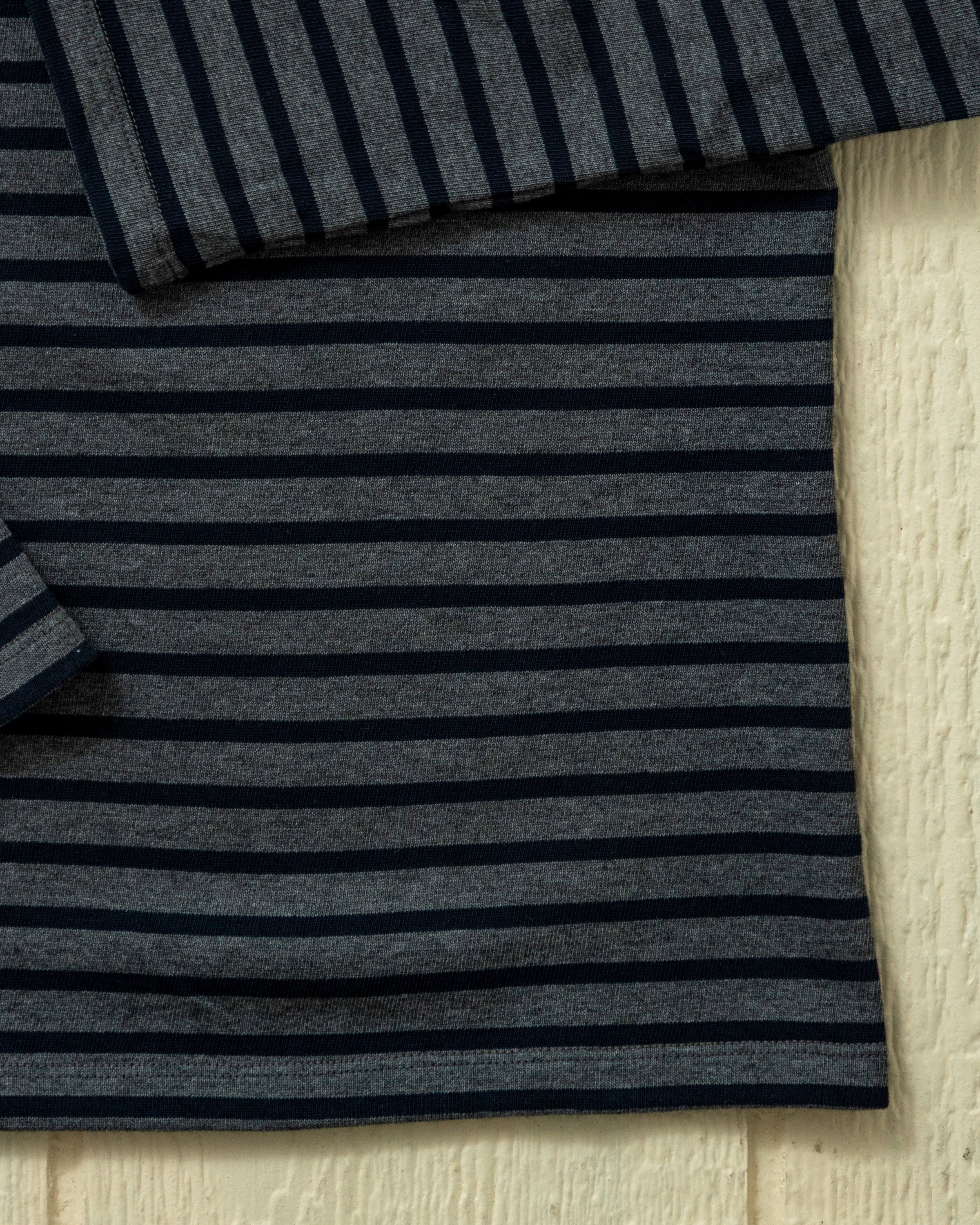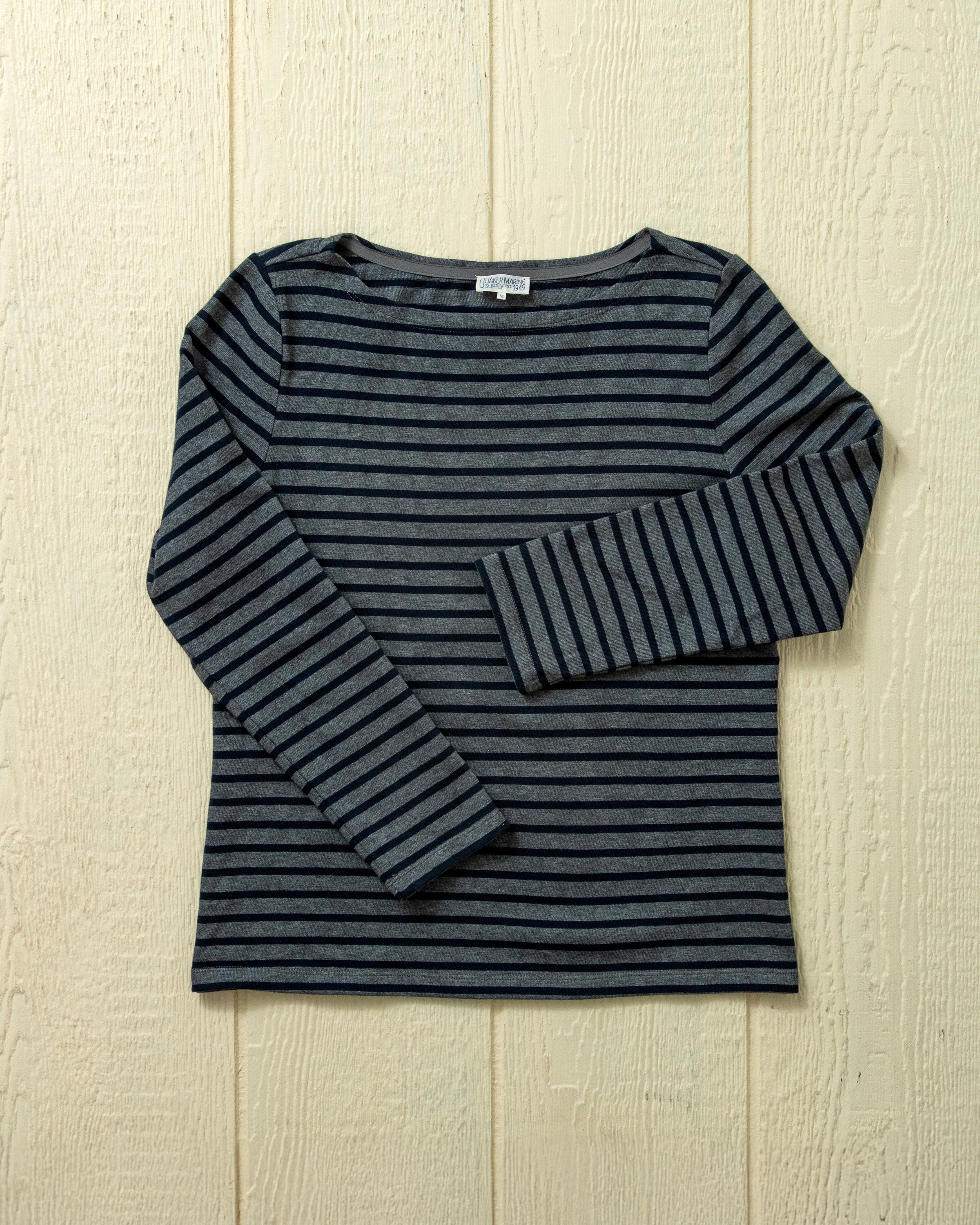 Women’s Breton Stripe Boatneck Tee in Navy/Grey Heather - XS is backordered and will ship as soon as it is back in stock.