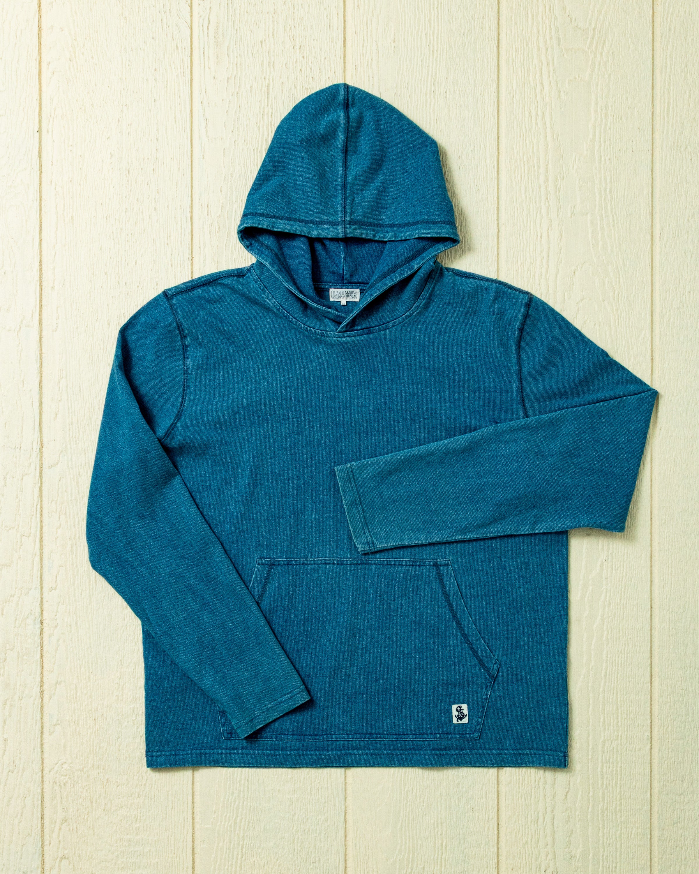 The Wharf Hoodie is an all-day all-season companion that will take you from your morning surf commute to a sunset beach bonfire with ease. Dyed with real indigo, this hoodie will develop a unique fade over time, making each one entirely unique to the wearer. Complete with a front kangaroo pocket, relaxed open sleeve cuffs, and a perfect-fitting hood.
