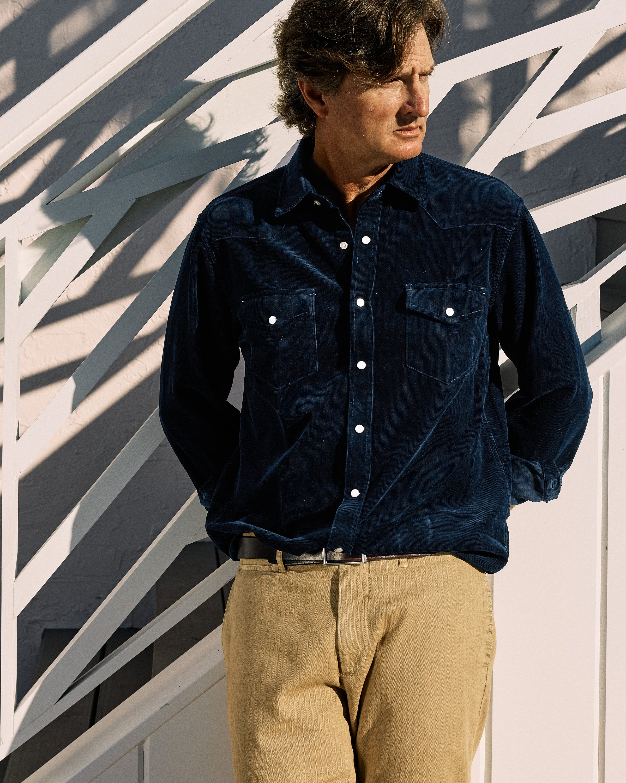 An essential in every man's closet, our Western shirts scream classic cool. No longer relegated to dude ranches, this shirt can add some refined flare under a blazer, but we think it looks best on its own with our Ventura Corduroy pants or your favorite jeans (if you're brave enough for the Canadian tuxedo). We used mother of pearl snaps for a look that will never go out of style.